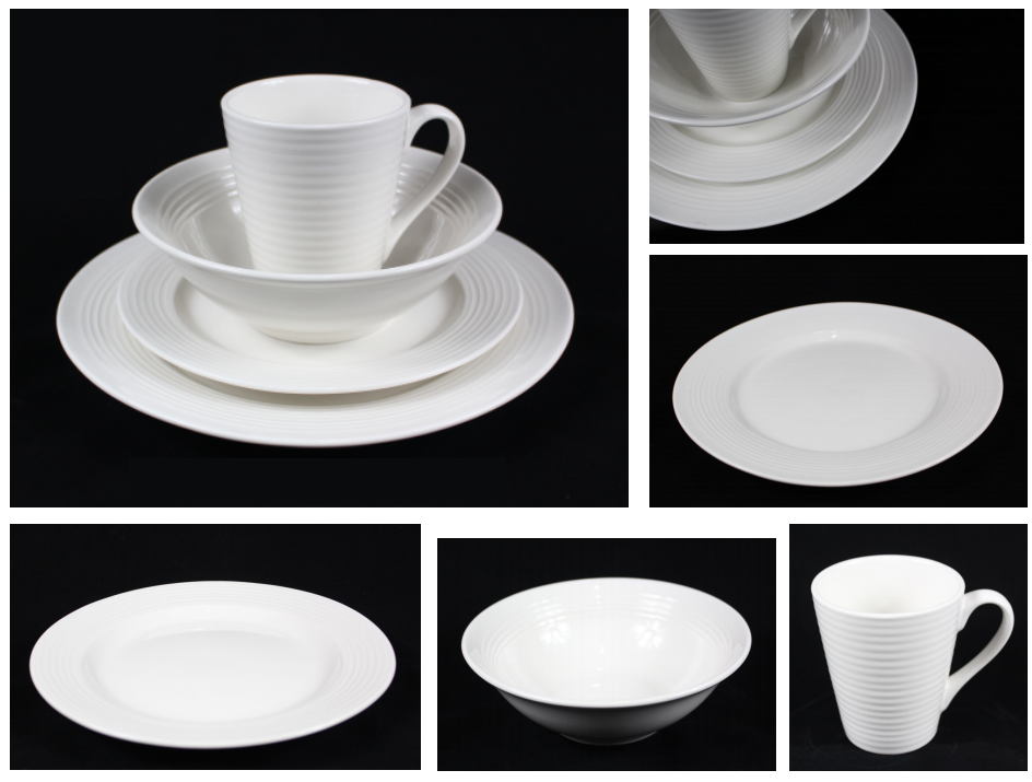 Product Description Aftersales White 16-Piece Set:four 4-piece place setting. Item No.:SX-03 Bone China Superior quality and design Dishwasher,microwave,and warm oven-safe
